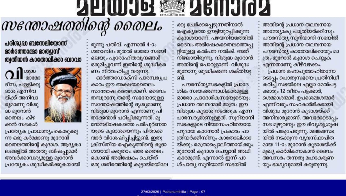 Consecration of Holy Chrism / HH Baselius Marthoma Mathews III Catholicoseമൂറോന് കൂദാശ (2026) March 27, 2026March 27, 2026 - by Joice MTV Photos: 1 2 Malankara Orthodox Syrian Church News Bulletin, 2026 March 26